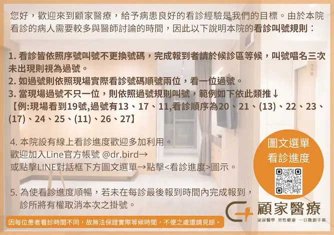 → 本診所為健保特約診所,台北顧芳瑜泌尿科診所及中山顧家泌尿科診所掛號費:健保掛號費為250元及部分負擔50元;桃園顧家泌尿科診所健保掛號費為200元及部分負擔50元。
